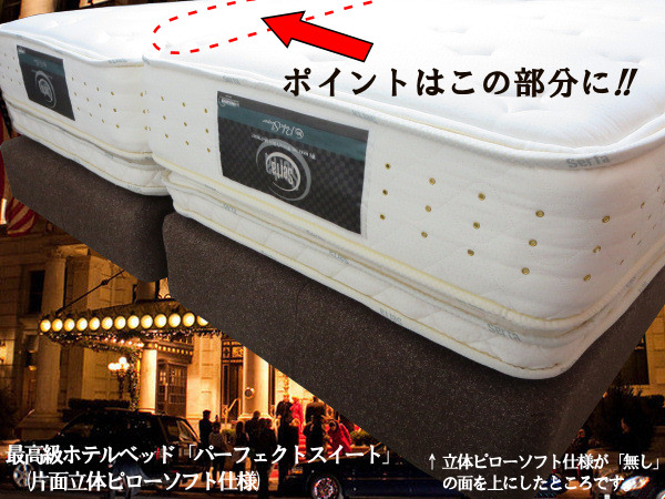 マットレスとマットレスを 完全にジョイントします! ジョイントはマットレスの表と裏、 両面に付きますので、 マットレスのローテーションで、 ひっくり返しても大丈夫。 ホテルベッドの高い技術を 味わって下さい。 |