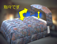 | ※この「ホテル羽毛ベッドカバー(直入れボックスタイプ)」は、ベッドをすっぽり下まで覆うスタイルです。その為、「デュベタイプ」とは異なり、より綺麗にベッドメイクして頂くにはベッド本体のサイズも関係してまいります。当サイトでベッドと一緒にご購入をいただきました場合は、当サイトのベッドサイズでお作り致しますが、もし単品でこの商品のみをご購入いただきます場合、お使いになられるベッドのサイズに合わせてお作りしております。 (ご注文後、メールにて、お持ちのベッドのサイズをお聞きします) |