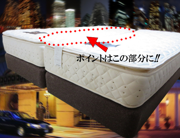 マットレスとマットレスを 完全にジョイントします! ジョイントはマットレスの表と裏、 両面に付きますので、 マットレスのローテーションで、 ひっくり返しても大丈夫。 ホテルベッドの高い技術を 味わって下さい。 |