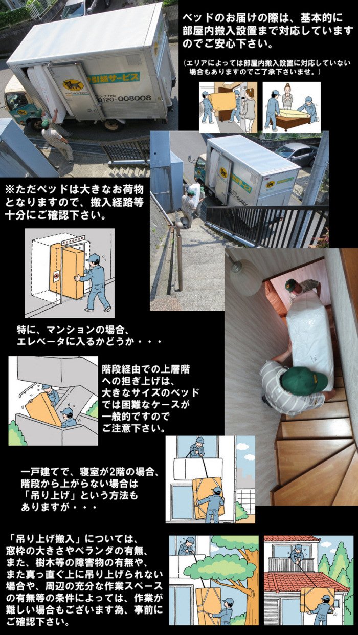 | ■基本的にベッドをお届けの際は、「お部屋内への搬入・設置まで対応」させて頂いておりますのでご安心下さい。 | ![]() |