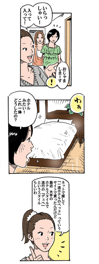 最近、大手ホテルで大流行のスタイル「デュベタイプ」。足元を巻き込んでベッドメイクしますので綺麗にパリッとメイクできます。 |